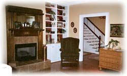The parlor of the farmhouse is the ideal size for hosting intimate gatherings such as small corporate retreats. The parlor is accessed from the foyer and is graced by the original antique oak mantel. Colors of deep reds, greens, and honey warm the senses and recall times of family gatherings long past. The furniture is a light Norwegian spruce in an English cottage style. Antique decorative accents enhance the feeling of being in a welcoming home. From the French doors, one can take a stroll directly onto the inviting porch filled with wicker furniture.